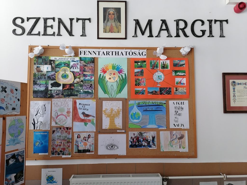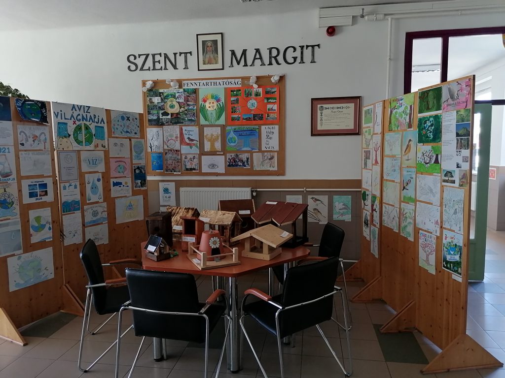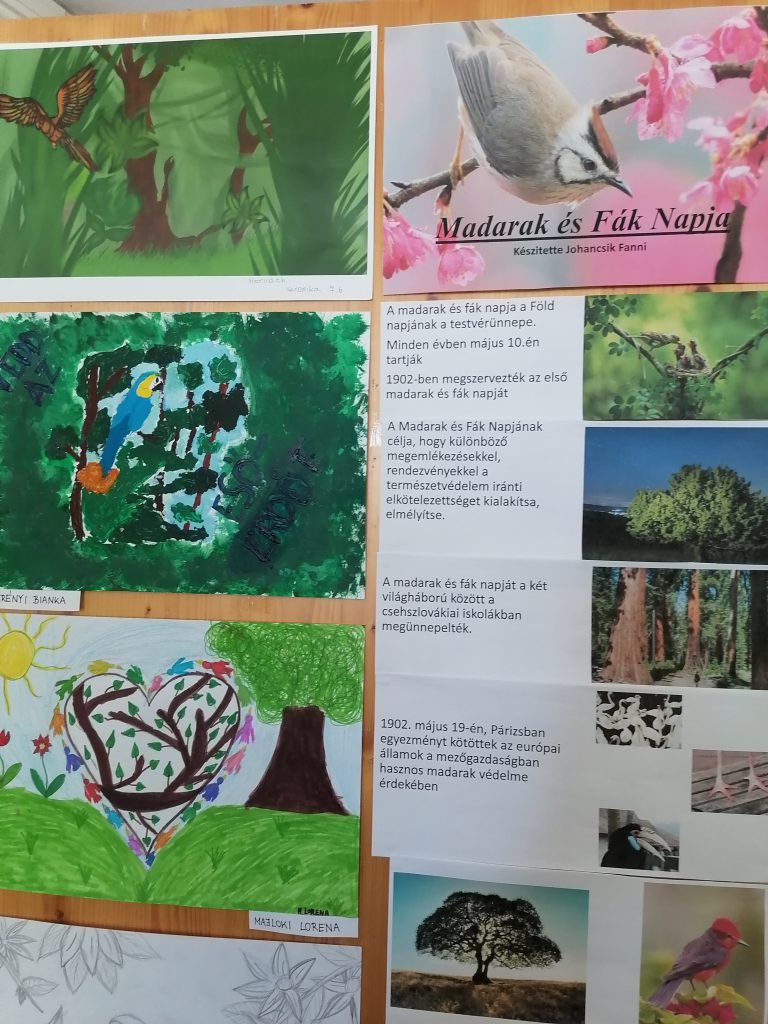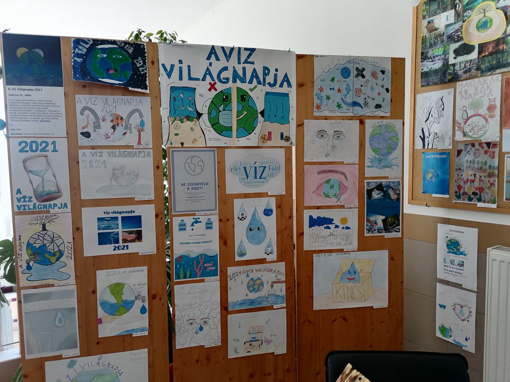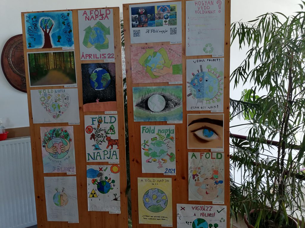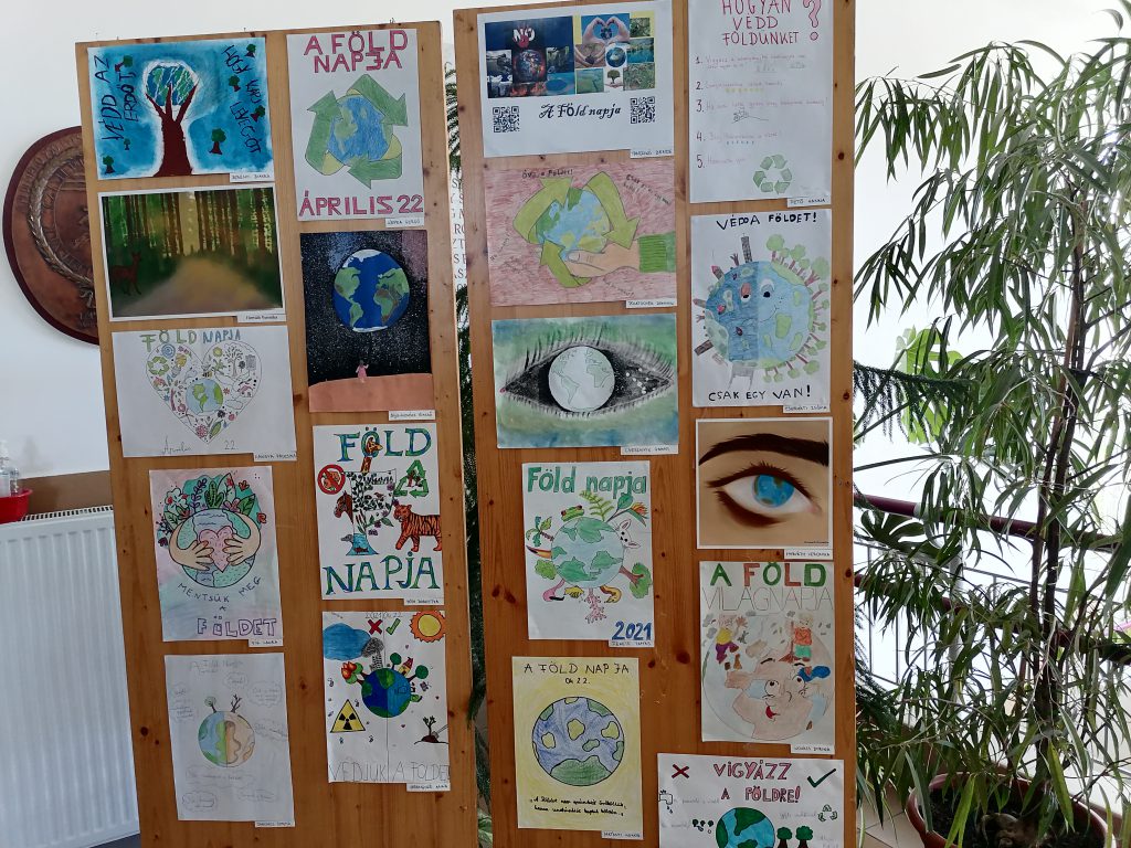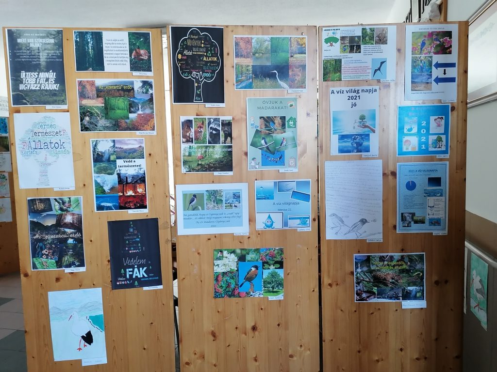 Iskolánkban a digitális oktatás ideje alatt a felső tagozatos tanulóknak pályázatokat hirdettünk meg a reál munkaközösség és a DÖK szervezésében a nevezetes világnapok alkalmából. A Víz, a Föld, a Madarak és Fák Napja, valamint a fenntarthatósági témahét tavaszi választott programja az „ezerarcú erdő”. Mára a hagyományos ünnepek kiegészültek a környezet és természetvédelemnek egy-egy jeles napjával. Jelesek, mert más tartalommal bírnak és más eszközöket, módszereket, „ünneplési módot” igényelnek. Mi az oka ennek? Az ember elfelejtette biológiai gyökereit, tönkre teszi maga körül a világot. Lassan bolygónk az emberi tevékenységek miatt alkalmatlan lesz az életre. Pusztulnak az erdők, a folyók, s velük együtt sok állat- és növényfaj is, a vízkészlet rohamosan fogy, szennyezett a levegő. Közös felelősség a folyamat megállításán fáradozni. Ezekben a napokban különösen fontossá válik a természetvédelem. A nevelés egyik kiemelt feladata, hogy megéreztessük, megérttessük a környezetvédelem fontosságát. Ez a gondolkodásmód azonban nem korlátozódhat a jeles napokra, a szemléletnek át kell szőnie az egész nevelést. Nem mindegy, milyen hatások érik a tanulókat a környezet és természet megismerés kapcsán. A környező világ tevékeny megismerésében a közvetlen tapasztalásra – megfigyelésre – vizsgálódásra – cselekvésre építünk. Legfontosabb törekvésünk a természet szeretetére és tiszteletére nevelni a ránk bízott gyerekeket. Az adott témákban a tanulóknak az online oktatás ideje alatt a tanórákon (földrajz, biológia, természetismeret, természettudomány, technika, életvitel és gyakorlat, vizuális kultúra) feladatokat kellett megoldaniuk. Ezeken kívül pedig lehetőségük volt a hirdetett pályázatokban részt venniük. Ezt tanulóink nagy létszámmal meg is tették. Nagyon sok pályázati munkát kaptunk. A Víz Világnapjára meghirdetett plakátpályázatra a beadott munkákat márciusban értékelték és kihirdették az eredményeket, május 10-én pedig átvehették tanulóink a jutalmakat a DÖK vezetőjétől. Május 10-én a Madarak és Fák Napjáról az iskolarádióban is megemlékeztünk. Egésznap különböző madarak énekhangjában is gyönyörködhettünk, s a nap folyamán a 8. osztályos tanulók fát ültettek az iskolánk udvarában. Ezen a héten adták le diákjaink a többi pályázati munkát a szaktanároknak is. Ezeket begyűjtöttük, s a legjobb munkákat kiállítottuk a nagy iskolában. A díjazásra június 14-én került sor, ahol a legeredményesebb munkákért a DÖK oklevelet és könyvjutalmat adományozott. Tavaszi pályázatok eredményei: