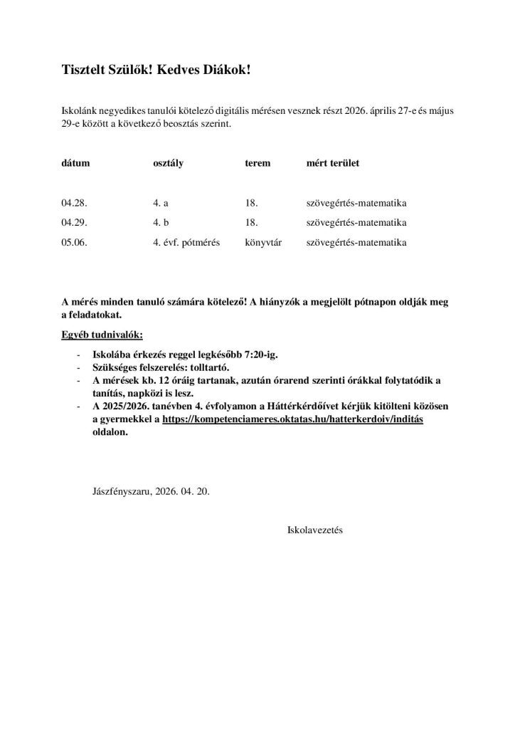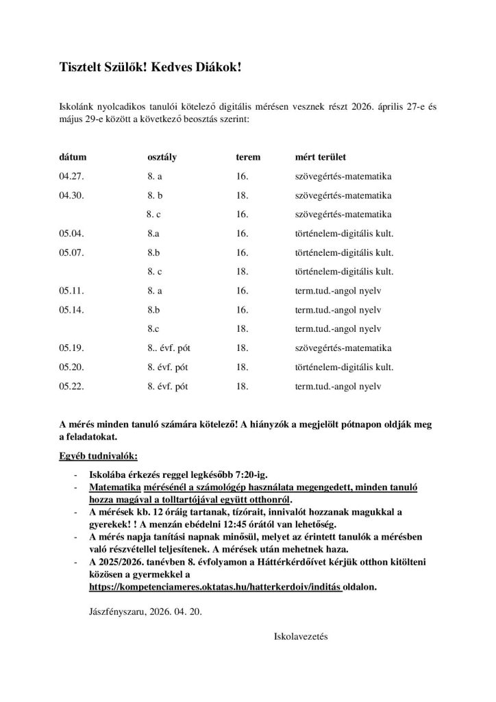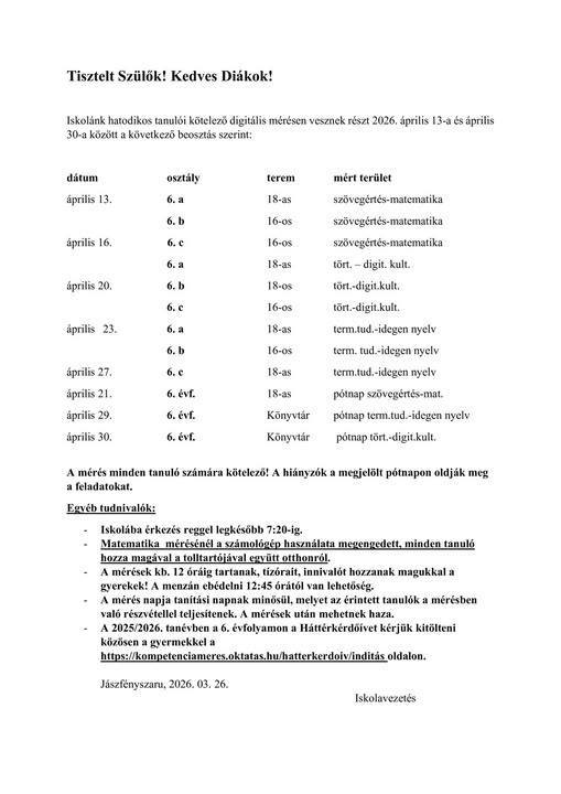 A Herman Ottó Kárpát-medencei Biológiaverseny Vármegyei Döntőjét 2026. 03. 27-én rendezték meg Szolnokon. Iskolánk 7. évfolyamos tanulója, Benedek Benett 3. helyezett, a 8. évfolyamos Petrezselyem Márk pedig 6. helyezett lett. Felkészítő pedagógus: Tóth Sándorné. Gratulálunk e szép eredményhez!