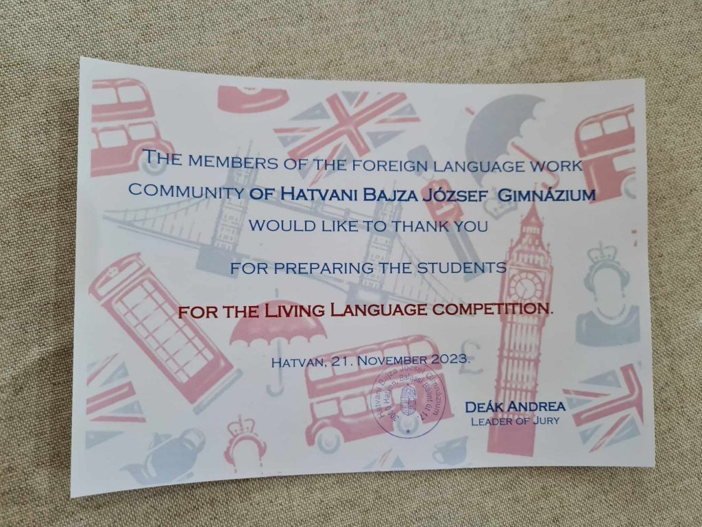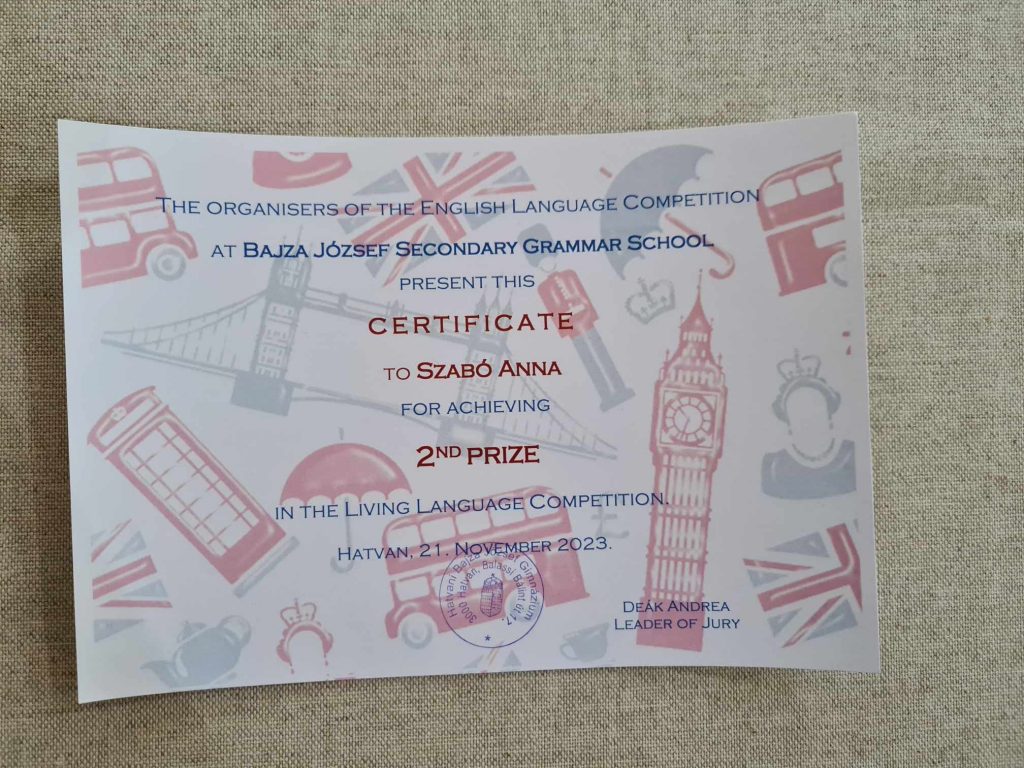 A HATVANI BAJZA JÓZSEF GIMNÁZIUM által meghirdetett angol versenyen 2. helyezett lett SZABÓ ANNA 8.a osztályos tanulónk