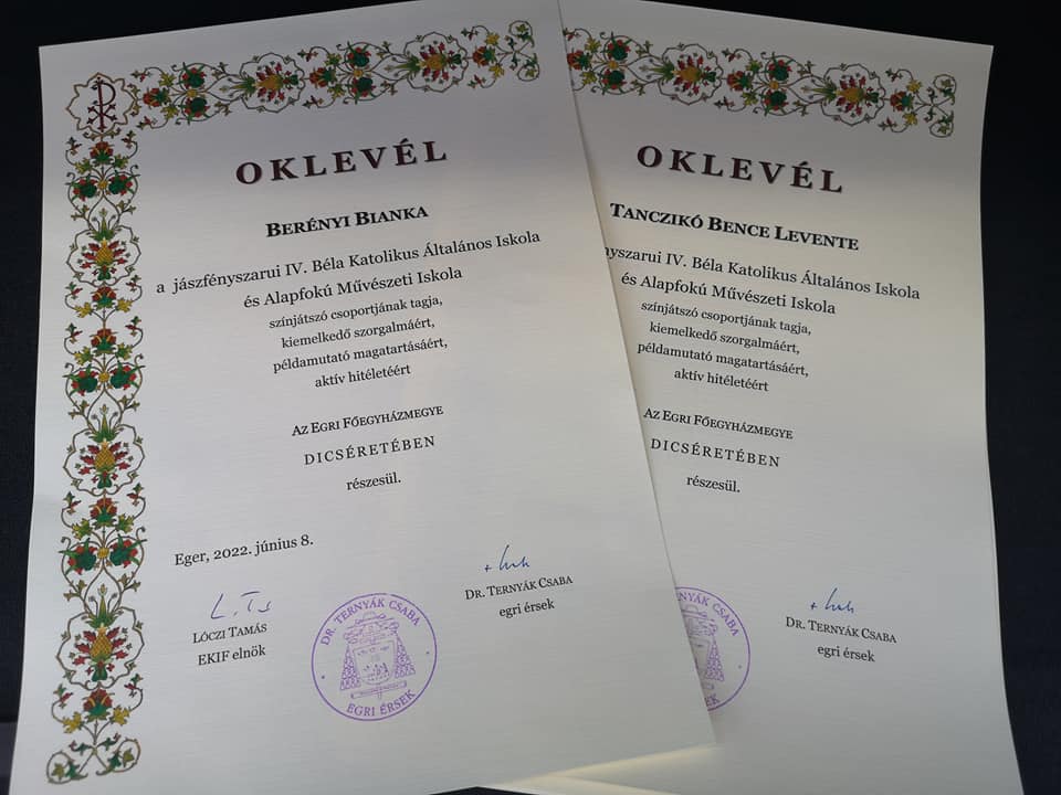 Berényi Bianka kiváló tanuló, példamutató magatartású és Tanczikó Bence Levente, akinek jeles tanulmányi eredménye mellett hitélete is példaértékű.A Napsugár Gyermekszínpad 1972-ben alakult Jászfényszarun, Kovács Andrásné életműdíjas drámapedagógus vezetésével. Azóta is országosan elismert szakmai műhelyként tartják számon. A személyiségfejlesztő munka mellett nagy hangsúlyt fektetnek a művészeti színvonalra is. Rendszeresen részt vesznek színjátszó fesztiválokon, ahol többnyire arany minősítést szereznek. A környék iskoláiba is járnak szerepelni, folyamatosan fejlesztve képességeiket. Közösségük nyitott, befogadó szellemű. Idén ünneplik fennállásuk 50.évfordulóját. Jelenleg 3 korcsoportban dolgoznak a művészeti iskola keretein belül, létszámuk 50 fő. Vezetőjük Kovács Tímea drámapedagógus.