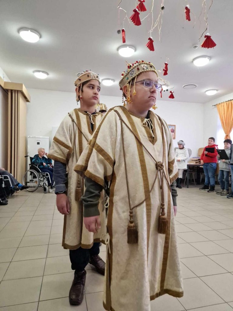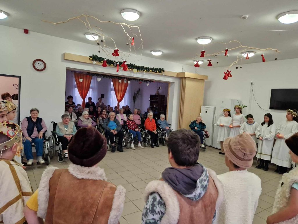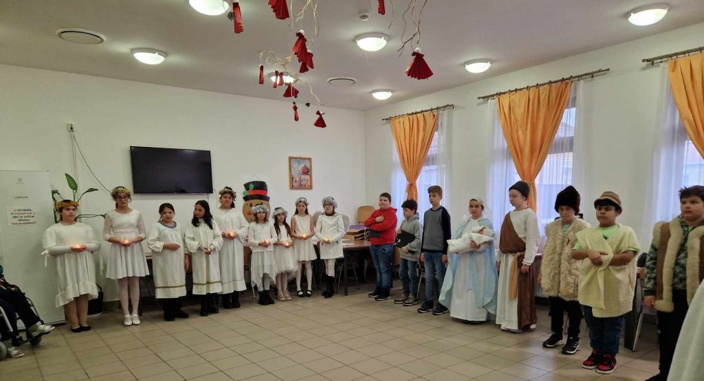 Az 5. évfolyamos diákok az idősek otthonában bemutatták a pásztorjátékot és saját készítésű angyalkákkal ajándékozták meg az ott lakókat és gondozókat.