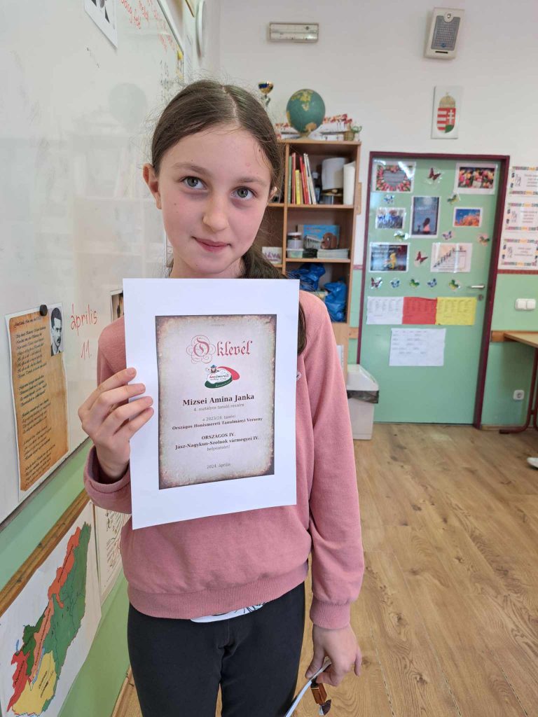 Mizsei Amina Janka 4.a osztályos tanuló 4.helyezést ért el az Országos Honismereti Tanulmányi Verseny vármegyei és országos listáján. Szeptember óta 4 fordulóban kellett elkészítenie a változatos feladatokat. Nagyon szoros mezőnyben csupán 1 ponttal maradt le a dobogóról. Szeretettel gratulálunk az eredményéhez!