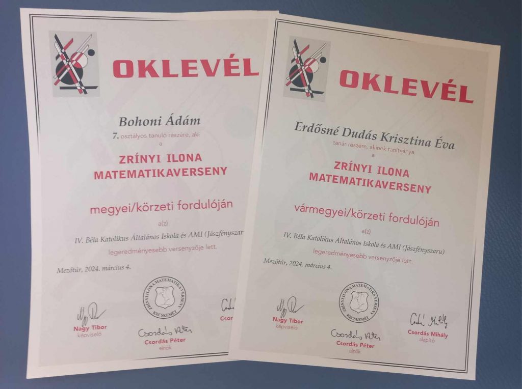 A Zrínyi Ilona Matematikaversenyen Bohoni Ádám a 7. b osztályosok versenyében vármegyei 13. helyezést ért el és ezzel iskolánk legeredményesebb versenyzője lett. Felkészítő pedagógus: Erdősné Dudás Krisztina Gratulálunk!