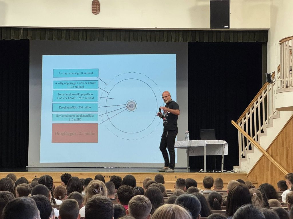 Ma délelőtt dr. Zacher Gábor főorvos, oxyológus, toxikológus, mentőorvos, egyetemi tanár tartott előadást iskolánk felső tagozatos tanulóinak.Az élvezeti szerek (drog, alkohol, nikotin, koffein) és a közösségi média veszélyeire hívta fel a figyelmet a Tőle megszokott őszinte, közérthető, szuggesztív, meggyőző előadásban, mert sosem lehet elég korán kezdeni a prevenciót!A nap többször visszatérő kijelentése: Merjünk NEM-et mondani!