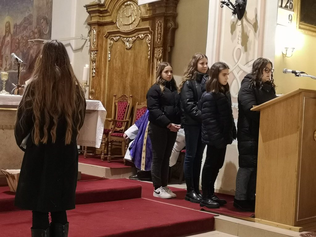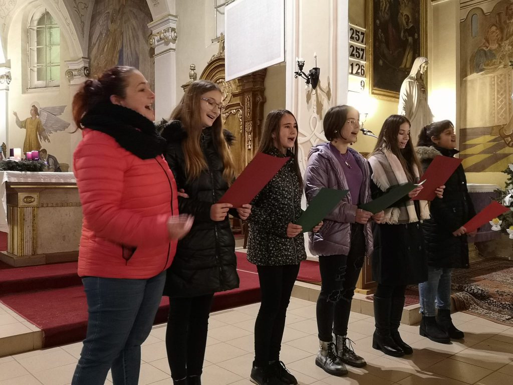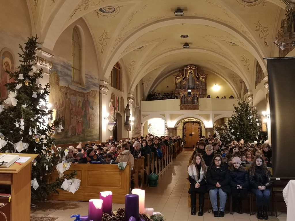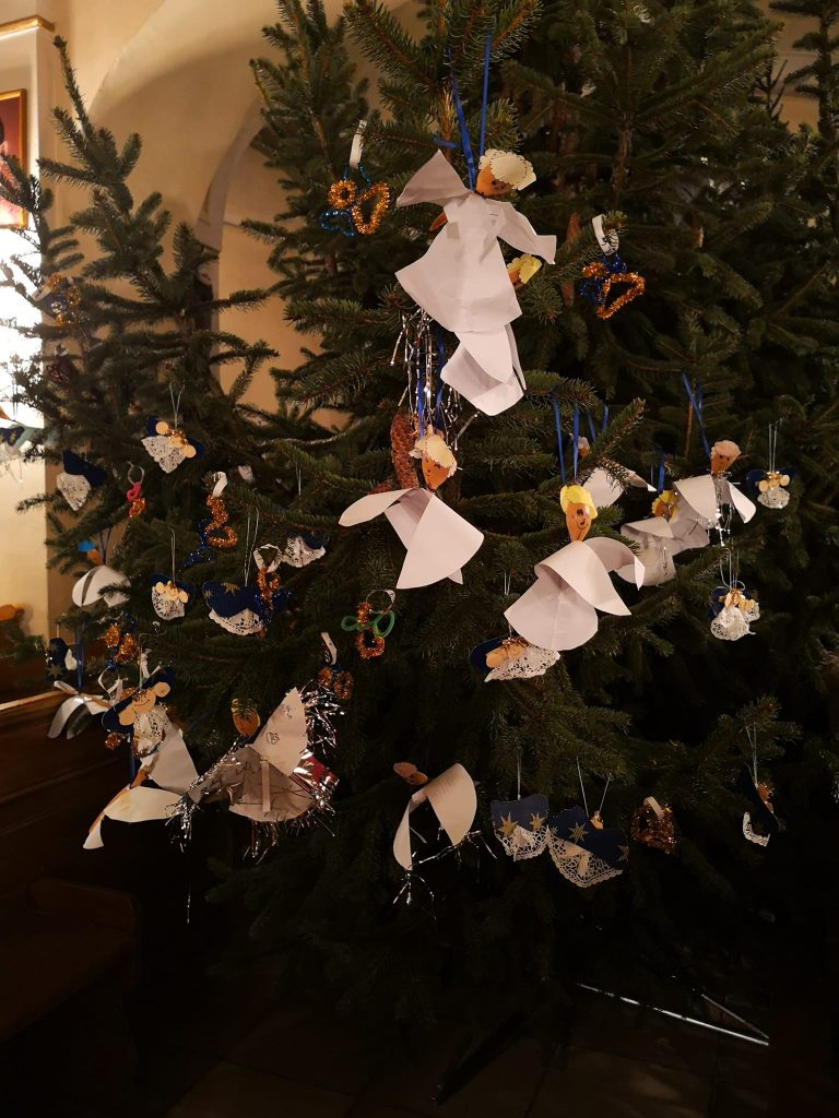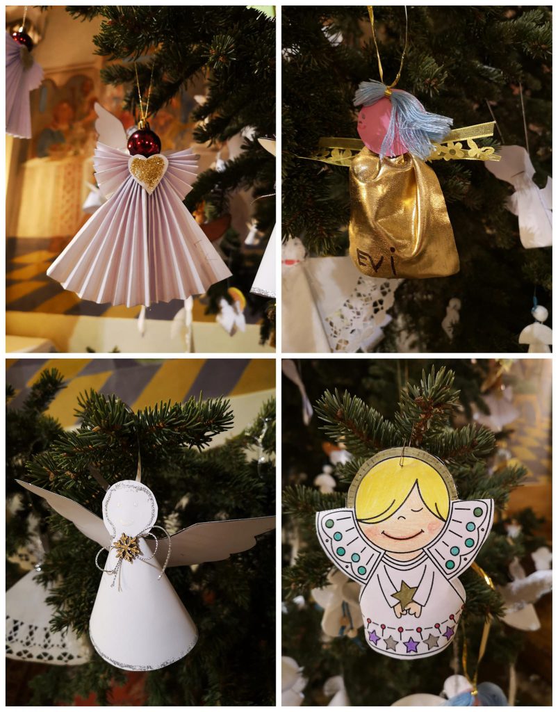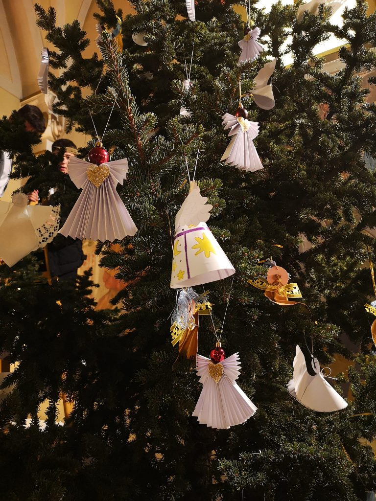 A szentmise kezdete előtt iskolánk minden osztálya az általuk készített karácsonyi angyalokkal díszítette fel templomunk karácsonyfáit.
